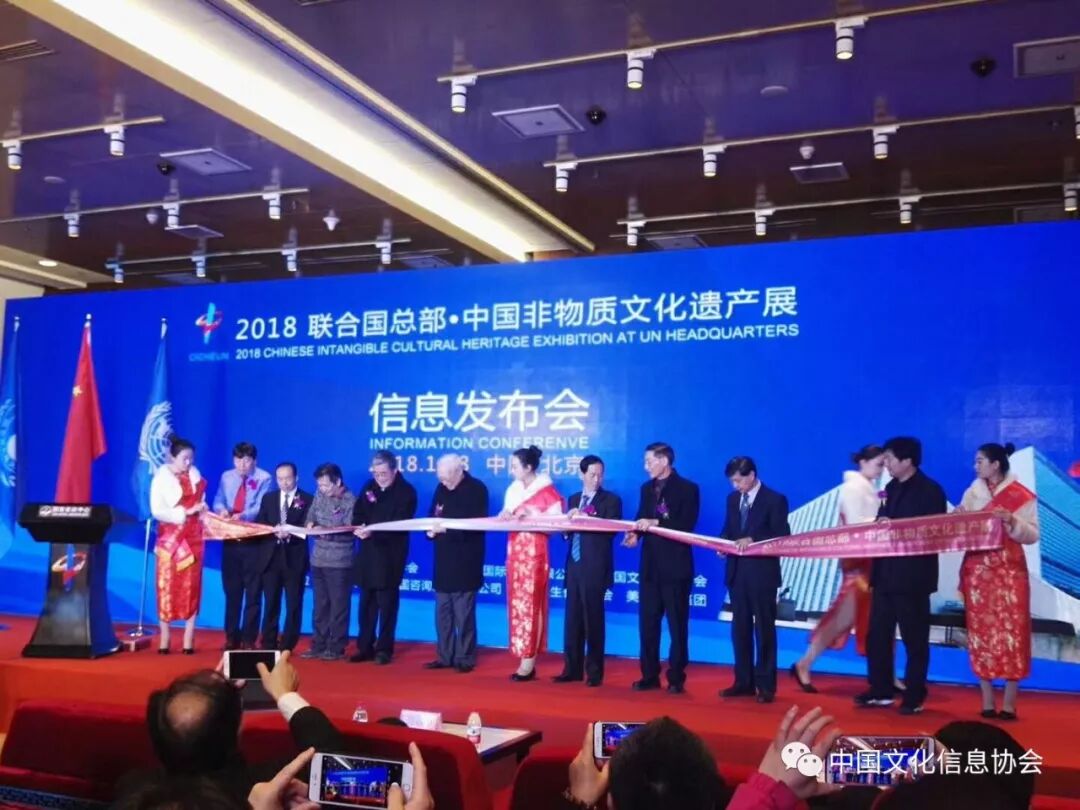 由中国文化信息协会、联合国太极学会、美国中华文化国际发展有限公司,1月28日上午在北京国家会议中心联合举办信息发布会。中国文化信息协会决定与联合国太极学会和美国中华文化国际发展有限公司将于2018年6月在联合国总部联合主办“2018联合国总部·中国非物质文化遗产展”。文化部原副部长艾青春,中国文联原副主席高运甲,国家中医药管理局原副局长李俊德,中国文化信息协会会长黄河浪、秘书长唐俊凯,中国文化传媒集团原监事会主席杨开金,美国中华文化国际发展有限公司董事长麻林城,中国非物质文化遗产传承人代表,以及中央电视台、央视新闻网、腾讯视频、搜狐视频、新华网、人民网、光明网、工人日报、中国青年报、北京晚报、环球时报等新闻媒体出席了信息发布会。